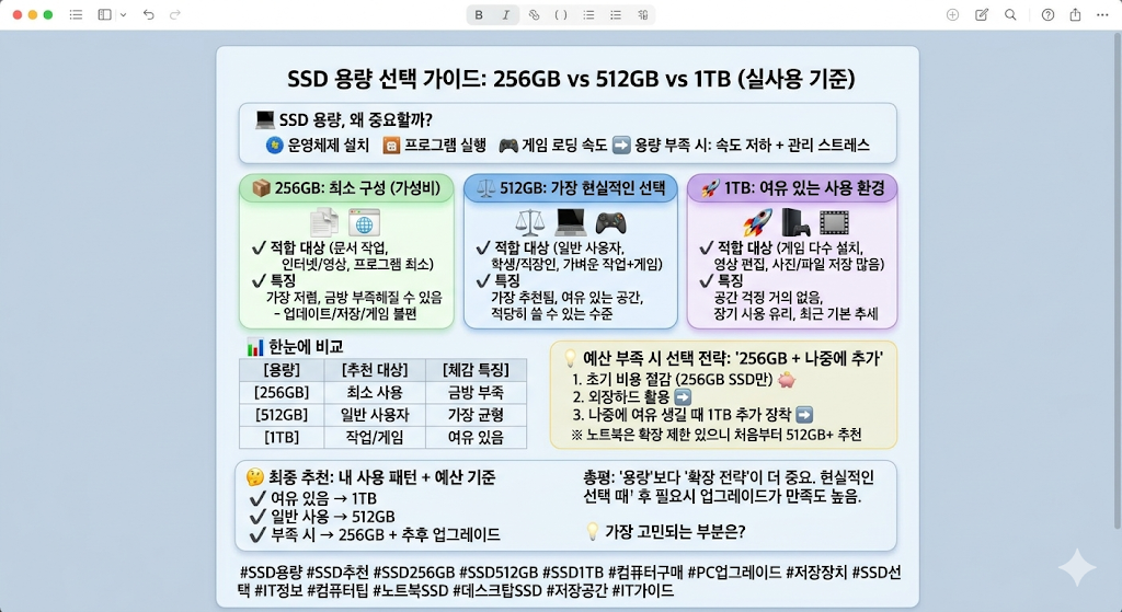 SSD용량,SSD추천,SSD256GB,SSD512GB,SSD1TB,컴퓨터구매,PC업그레이드,저장장치,SSD선택,IT정보,컴퓨터팁,노트북SSD,데스크탑SSD,저장공간,IT가이드